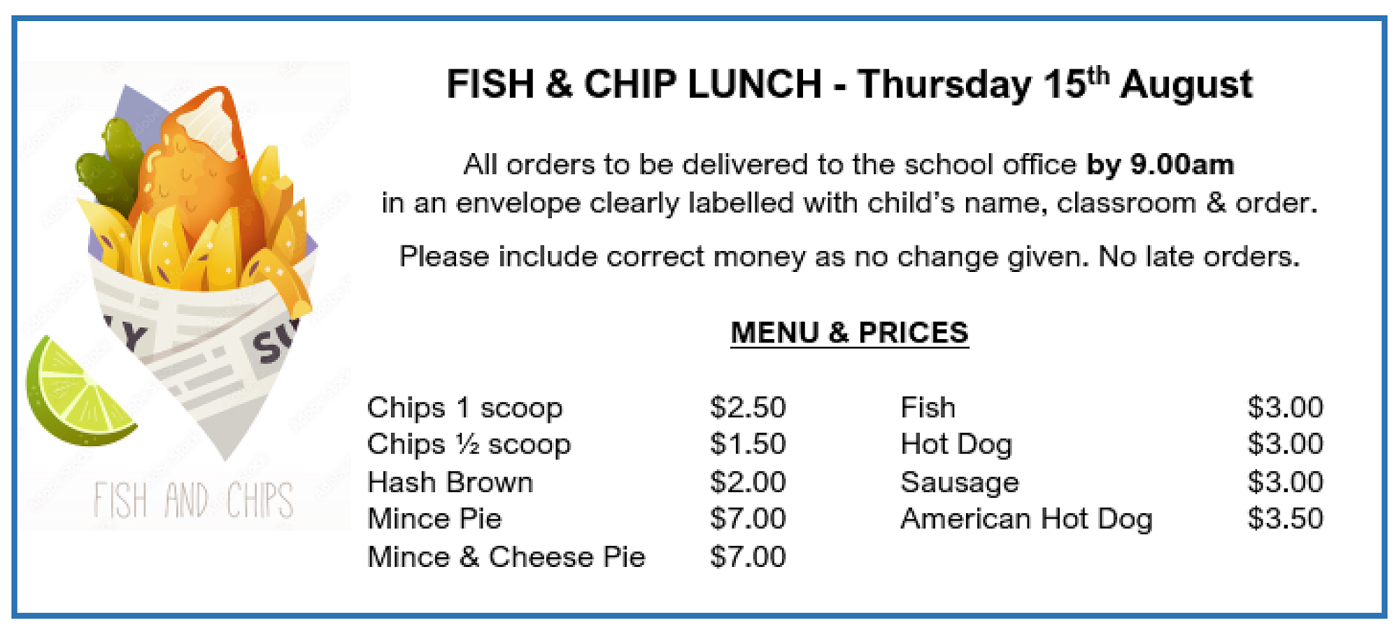 Fish & Chip Lunch Fish & Chip Lunch | Thursday 15 August Admin — August 9th, 2024 Fish & Chip Lunch | Thursday 15th August Other Fish & Chip lunch dates for Term 3: 29th August 12th & 26th September