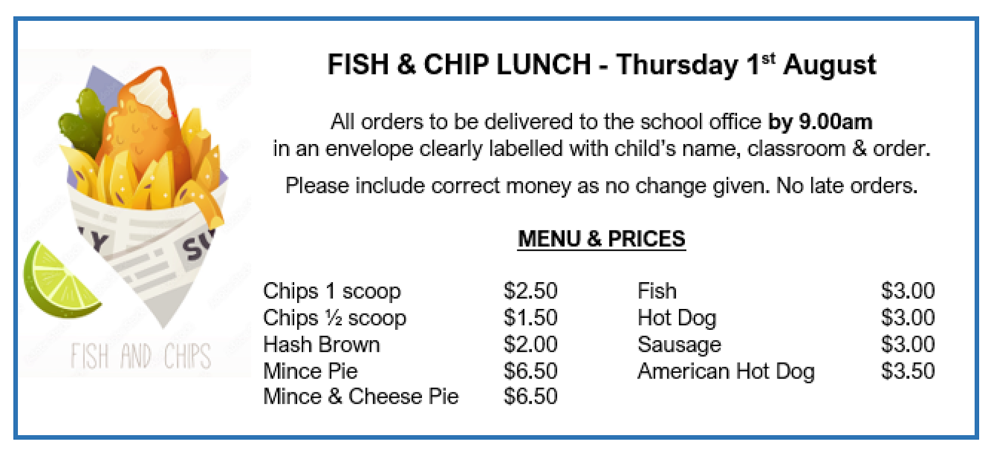 Fish & Chip Lunch Fish & Chip Lunch Admin — July 26th, 2024 Fish & Chip Lunch 1Aug24 Other Fish & Chip lunch dates for Term 3: 15th & 29th August 12th & 26th September
