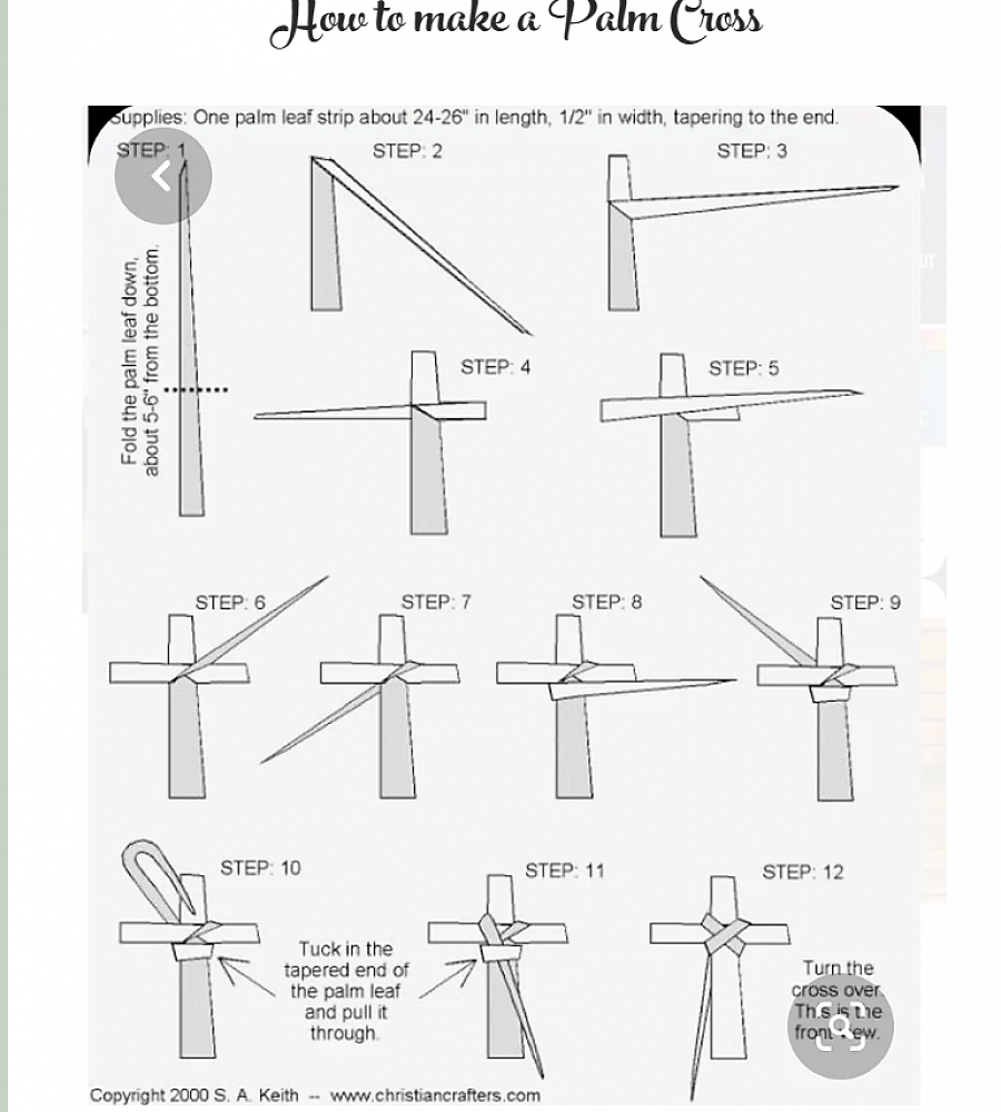 There are many different ways to make a palm cross from the simple to the complex. Many of these can be found on YouTube by searching for palm crosses. We have attached two images that demonstrate two different ways.
