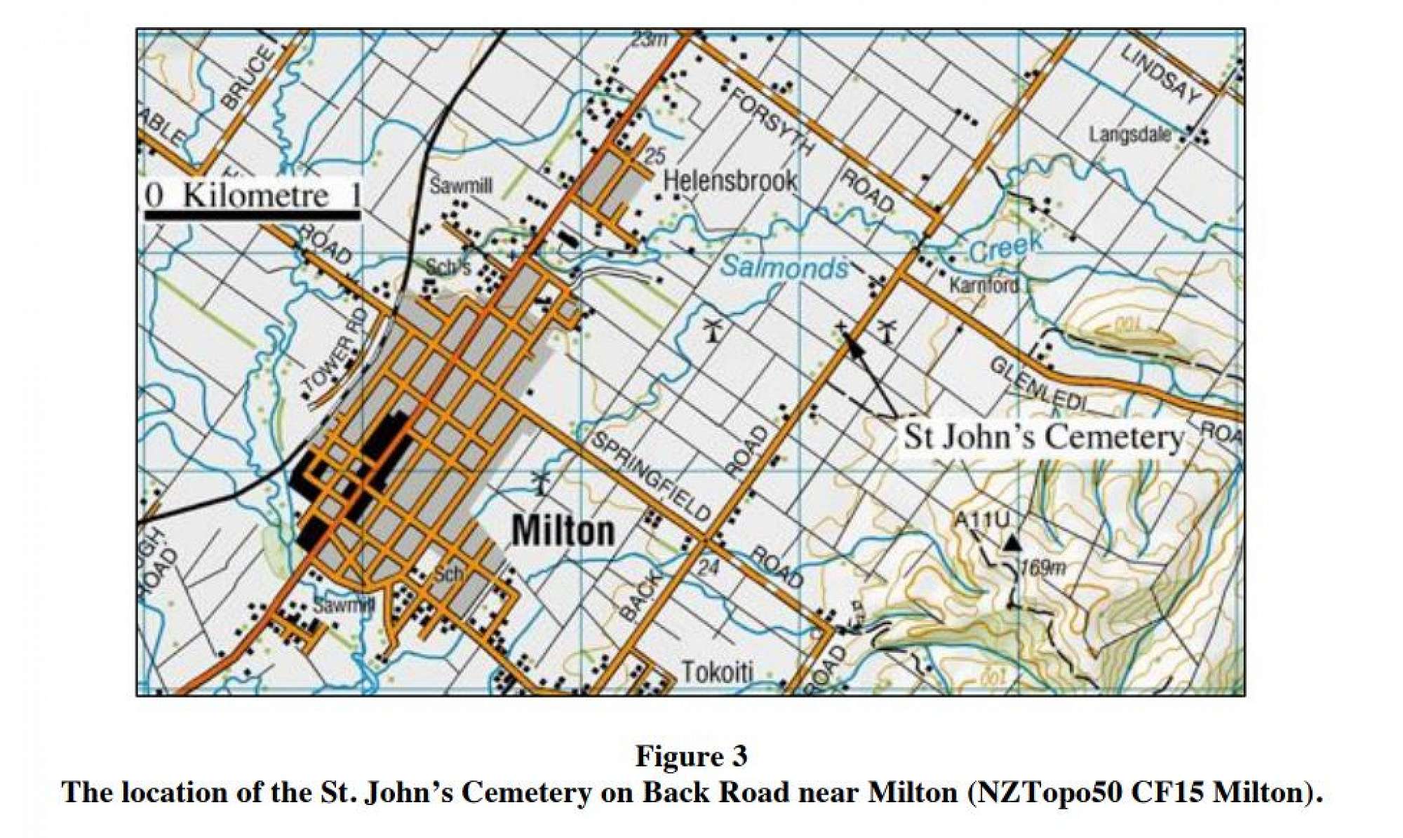 After issues with site suitability (the first site selected would have required expensive foundations) and costs (the first design selected through a competition was too expensive to build) a new brick church was erected in the township in 1866, with John Dewe laying the foundation stone in January that year (Fraser 1941: 7; Sumpter & Lewis 1949: 52). The exact fate of the old Back Road chapel is difficult to determine: it was probably sold for removal from the cemetery site, and later destroyed by fire. Fraser (1941: 16) stated: ‘according to the minute book of the Vestry it was sold to Mr. Hare for £7 in 1883, the old harmonium being brought to Milton for Sunday School use. It was later destroyed by fire.’ Another source states that it was removed to Clarendon in about 1868 (Findlay et al 2015). The use of the old St. John’s Cemetery had also declined, and by 1898 the cemetery trust was requesting that it be closed. According to the St John’s Parish Burial Register only five burials were undertaken after 1900. The last known burial was of John Moore in 1926, and the cemetery ground fell into disrepair and the boundaries were lost. The cemetery was formally closed in 1971 and the control and management was vested to the Dunedin Diocesan Trust Board.