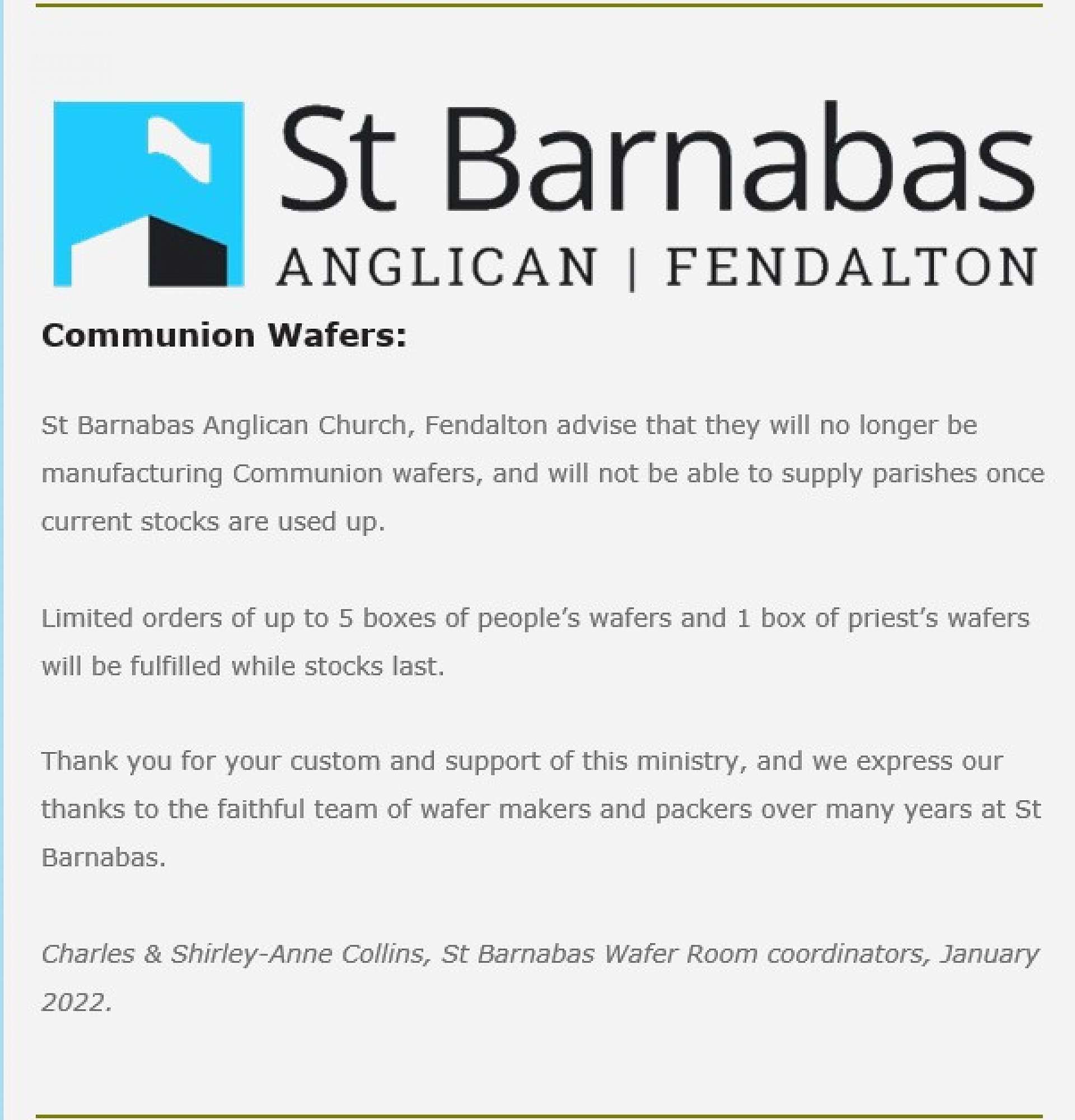 St Barnabas Anglican Church Fendalton are no longer manufacturing communion wafers