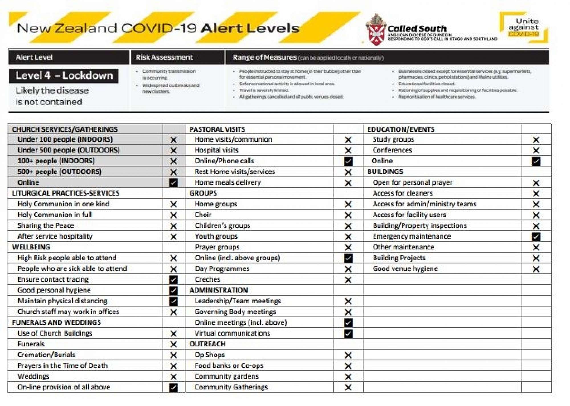 At Levels 3 and 4 all public buildings are closed. This means that they are not open for personal prayer, access for cleaners, access for administration/ministry teams, for other facility users of your buildings, maintenance or building projects. You are able to arrange access for emergency maintenance. As indicated above, under Level 3, Funerals and Weddings can take place, but are limited to a maximum of 10 people and the venue they take place in must conform to strict hygiene standards. In our Diocese we are strongly recommending that church premises are not used unless authorised by the Bishop. For funerals, we recommend using facilities provided by funeral directors. No hospitality is able to be offered at weddings or funerals at this time.