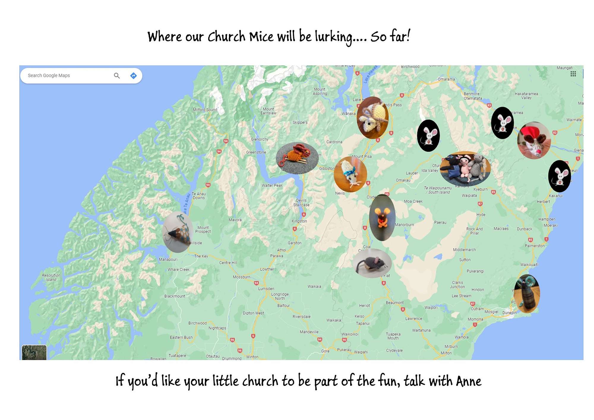 E. Let Anne van Gend know the name of your mouse and give me a photo of him/her. I will then produce a brochure that we can give to the bike hire places and tourist places, outlining a Mouse Pilgrimage that cyclists or others can do, where they collect a full “set” of church mice as they travel. We can have a Central Set, a Southern Set, a Lakes Set and a Waitaki Set. If anyone ever collected all four sets, maybe we could have some acknowledgement from the diocese or something?!