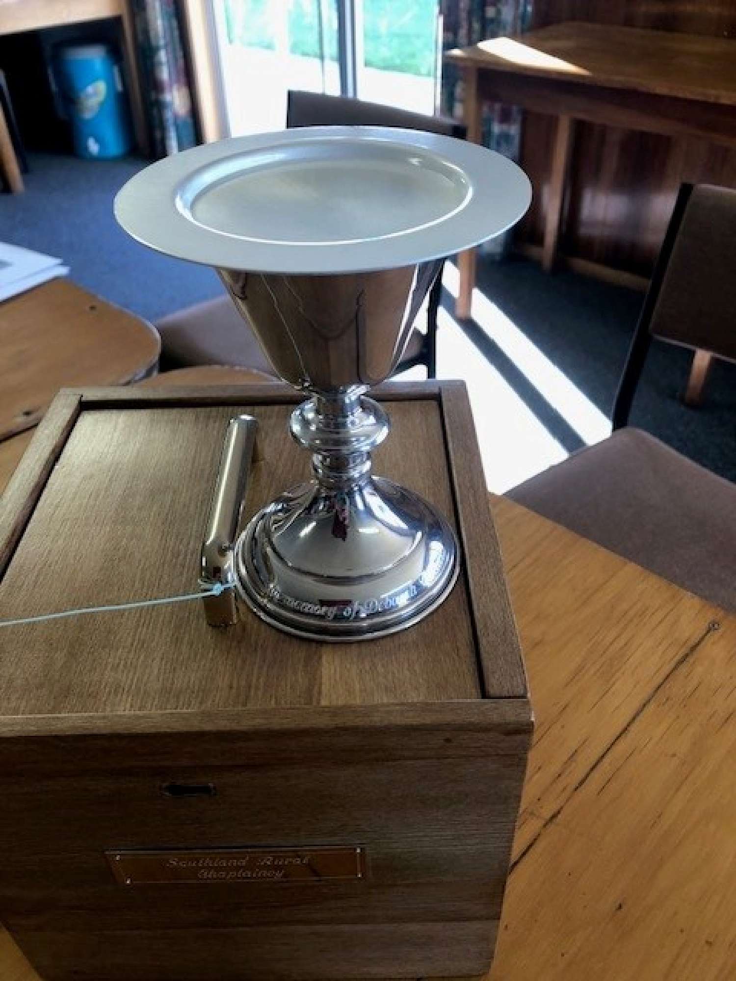 When Balfour church was secularised in May, a number of key people were unable to attend due to COVID-19 isolation requirements, so this was an opportunity for some who couldn't gather then to meet, give thanks and to use a new communion set. This chalice and paten will be used for smaller Eucharistic services - such as this one - held in people's homes and other venues. What makes the set even more special is that Stan Fissenden of the Gore Woodturners group generously designed and built a travelling box for all the vessels out of the wood from a bench in the Balfour Church Hall.