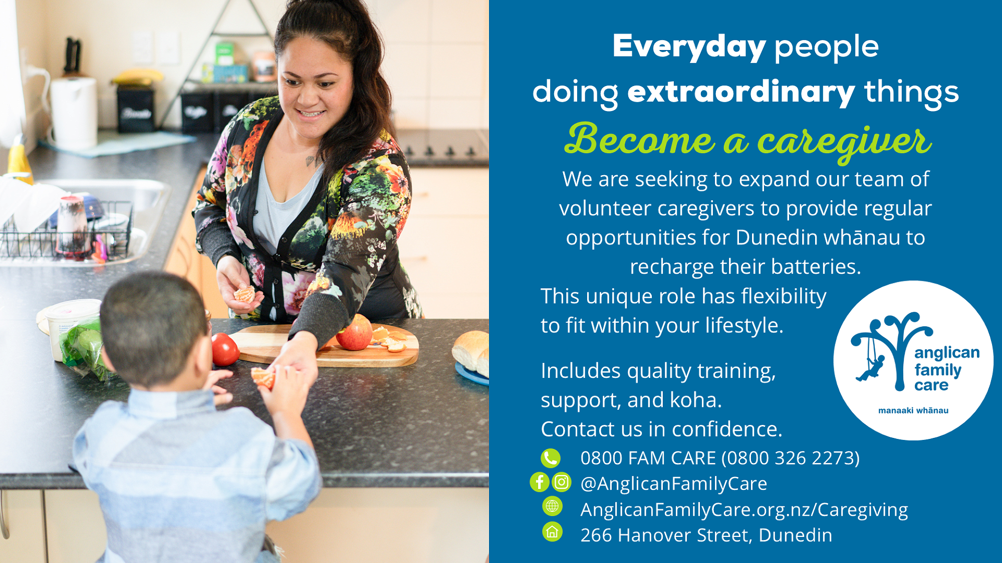 Anglican Family Care are seeking to expand our team of volunteer caregivers to provide regular opportunities for Dunedin whānau to recharge their batteries.