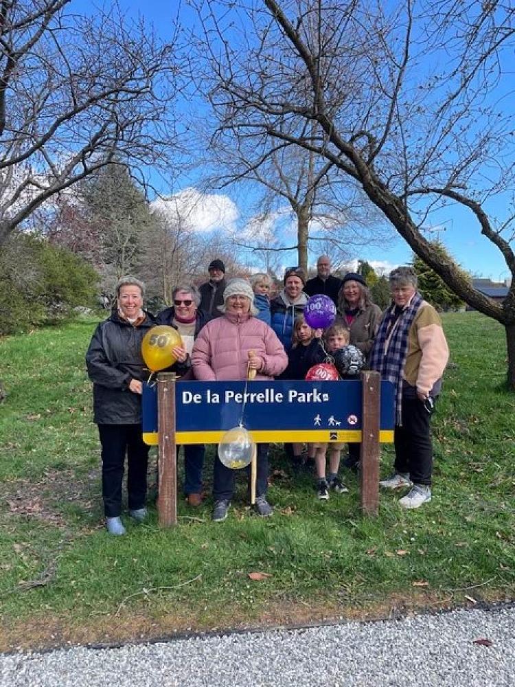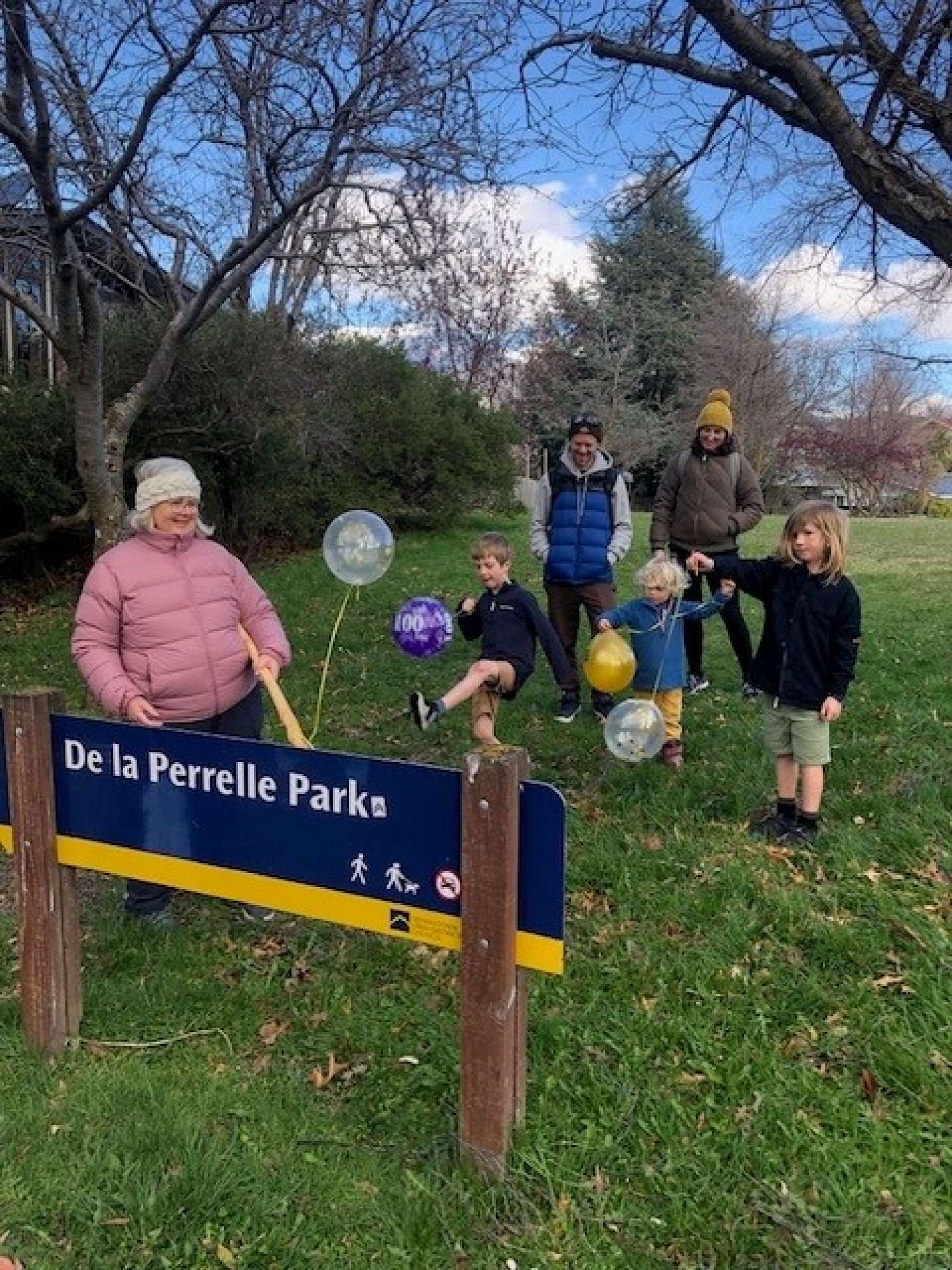 (Above) de la Perrelle whanau gathered in the de la Perrelle park to pay tribute to Elias and Helen de la Perrelle and to acknowledge the contribution both of them made to Arrowtown during 1863-1890s. The park is name after Philip de la Perrelle , a parliamentarian and Government minister who was Elias and Helen’s son.