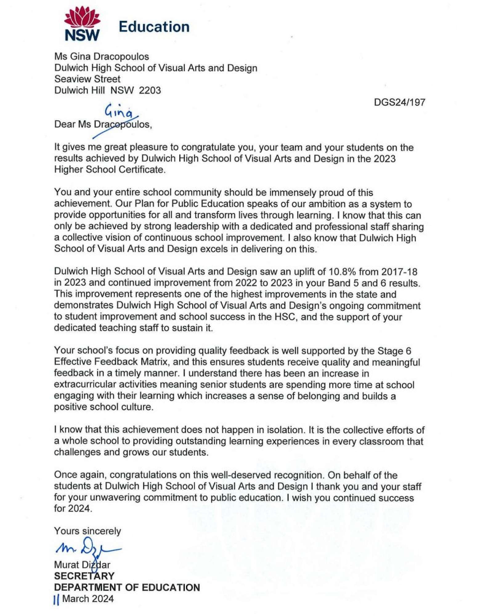 I am pleased to share with you, a letter I received from The Secretary of Education, Mr Murat Dizdar, which acknowledges our 2023 HSC results and the hard work and commitment of staff.
