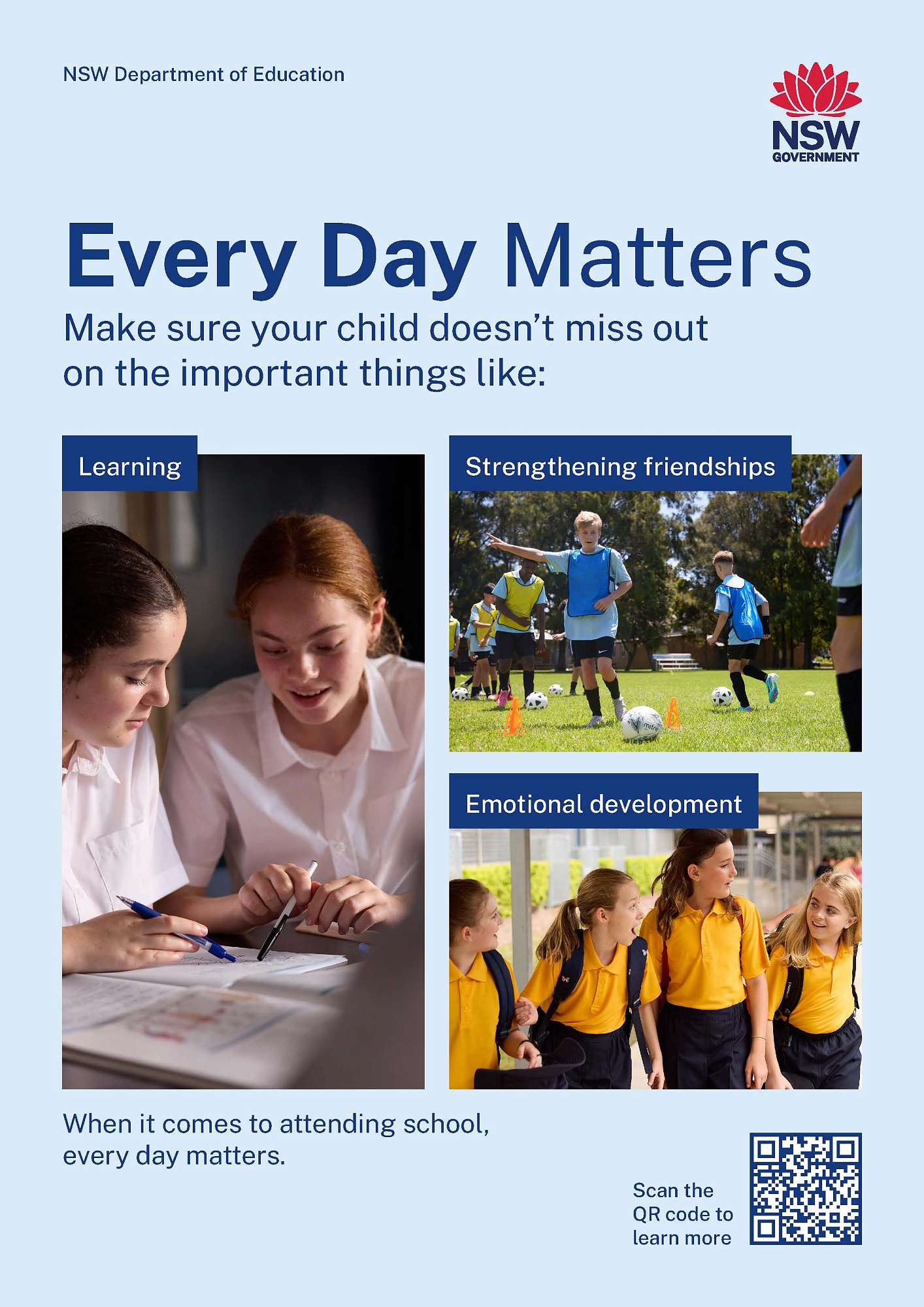 We know that school is the best place to learn. By attending school every day your child will get the most out of their learning and improve their career and life options. Consistent attendance improves student outcomes, increases career options, and helps students build relationships and confidence.