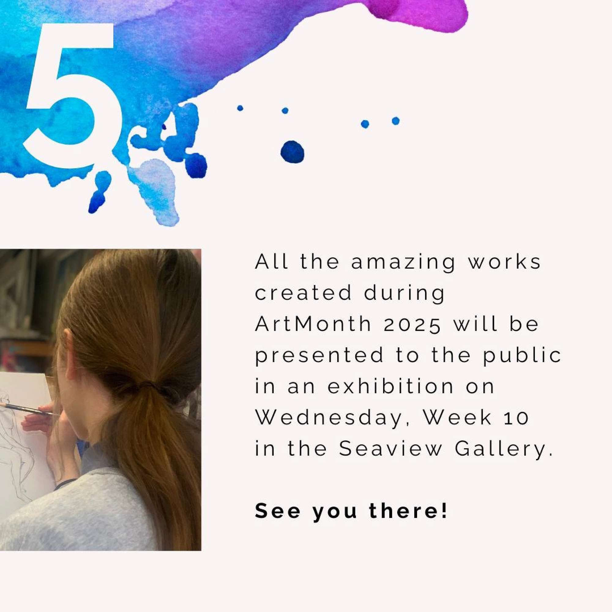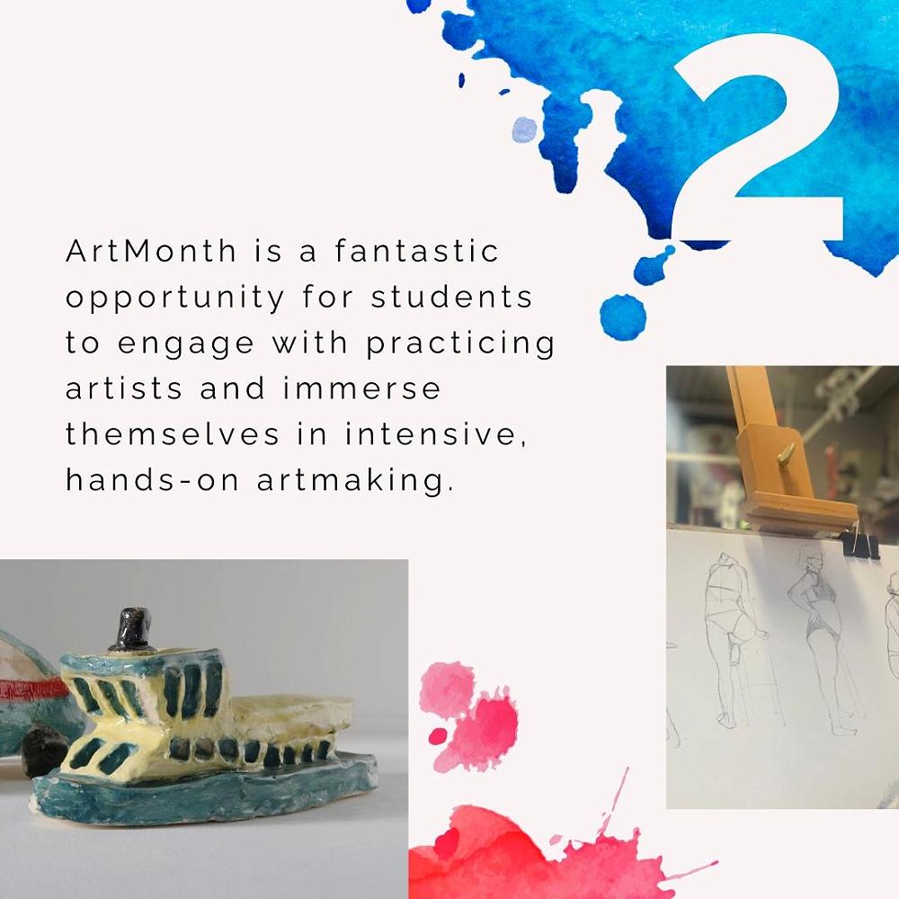 Artmonth begins in Week 5 with 17 artist workshops occurring over three weeks and culminating in the Artmonth 25 exhibition. Please note that additional information on the exhibition will be provided towards the end of the term.