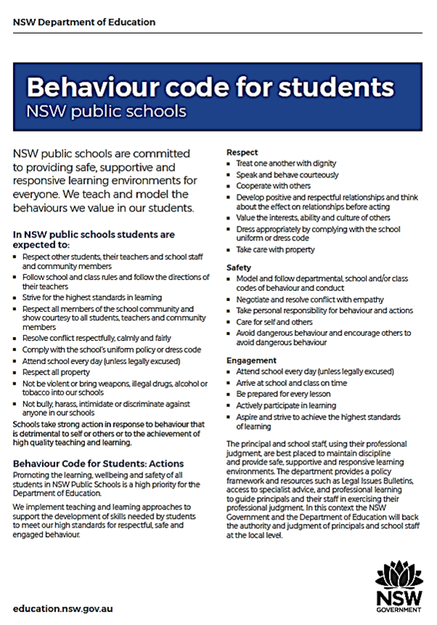 NSW public schools are committed to provided safe supportive and responsive learning environments for everyone. We teach and model the behaviours we value in our students.