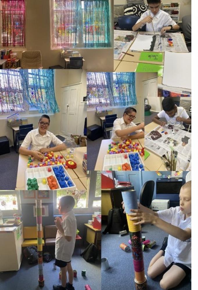 We are using coloured dice in Maths for numeracy tasks as well as sorting activities. The students are learning about colour theory and mixing primary and secondary colours. Stacking and sorting are also popular tasks for when our students require a brain break for sensory regulation. We have also hung rainbow coloured tassle curtains that blow in the breeze, creating sensory sounds and patterns for the students to have their visual sensory needs met.