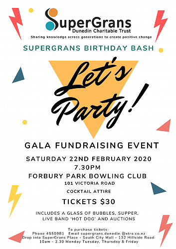 SuperGrans are celebrating their birthday with a gala fundraising event. Come along for a great evening out, with live music, supper, and auctions.