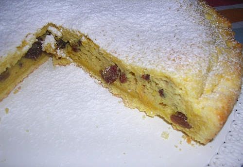 In a large bowl, beat cheeses together, then add vanilla, sugar, cornflour, cream, egg yolks and zest of 1 lemon if using. Beat well. Add sultanas. In another bowl beat egg whites (including extra egg white if used yolk in pastry) until stiff but not dry. Carefully fold whites into cheese mixture. Pour into pie plate and sprinkle top with flaked almonds. (If you don't have flaked almonds, don't worry, just dust torte with icing sugar when it is out of the oven) Bake for about 50 minutes in a 180 degree oven.