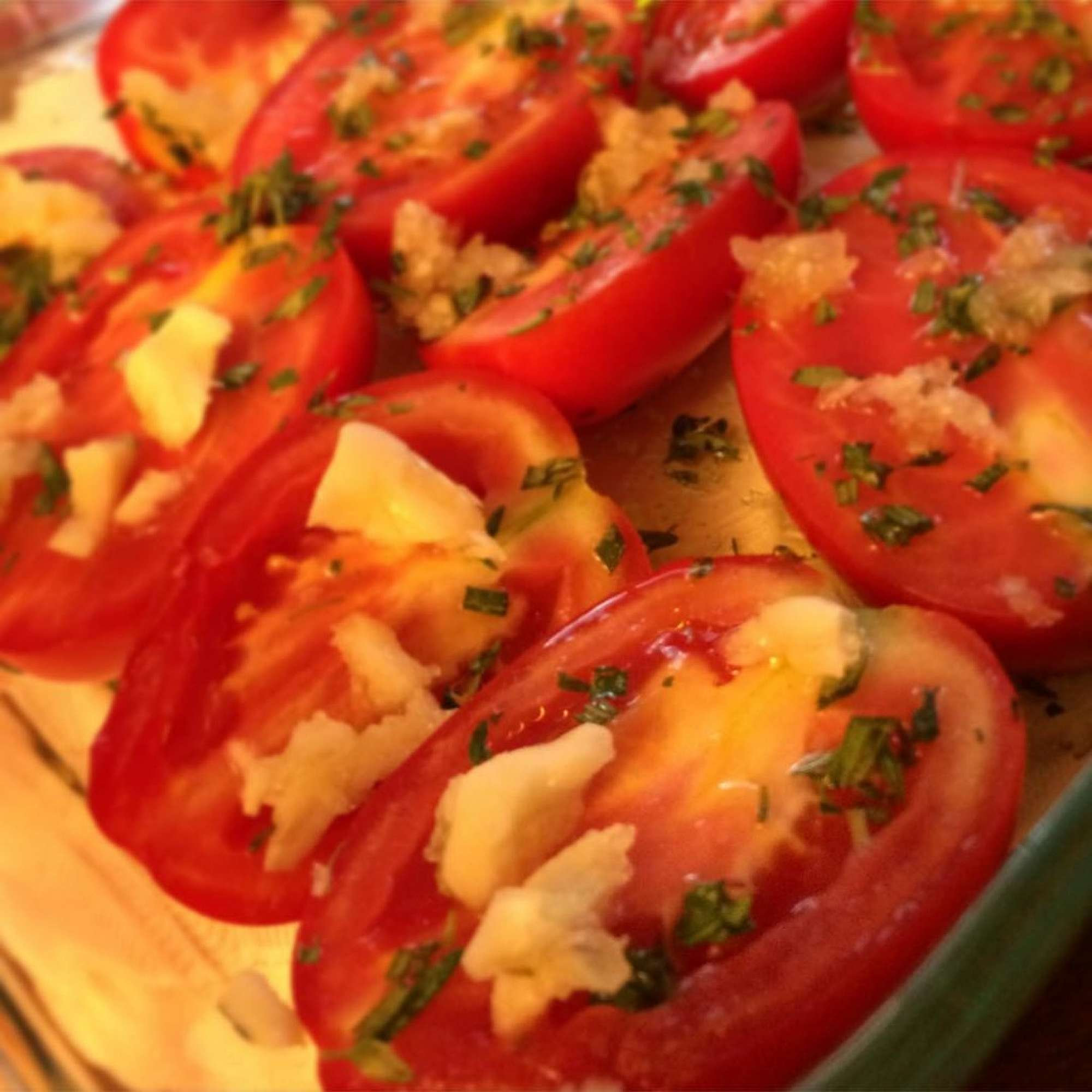 Heat oven to 160 degrees. Halve the tomatoes lengthwise and place cut side up in a shallow baking dish, spacing them apart. Place a slice of garlic on top of each tomato, then scatter marjoram leaves on top. Drizzle with olive oil and balsamic and sprinkle with salt and pepper. Bake for about 30 to 50 minutes, basting tomatoes with pan juices halfway through cooking. Serve warm or room temperature.