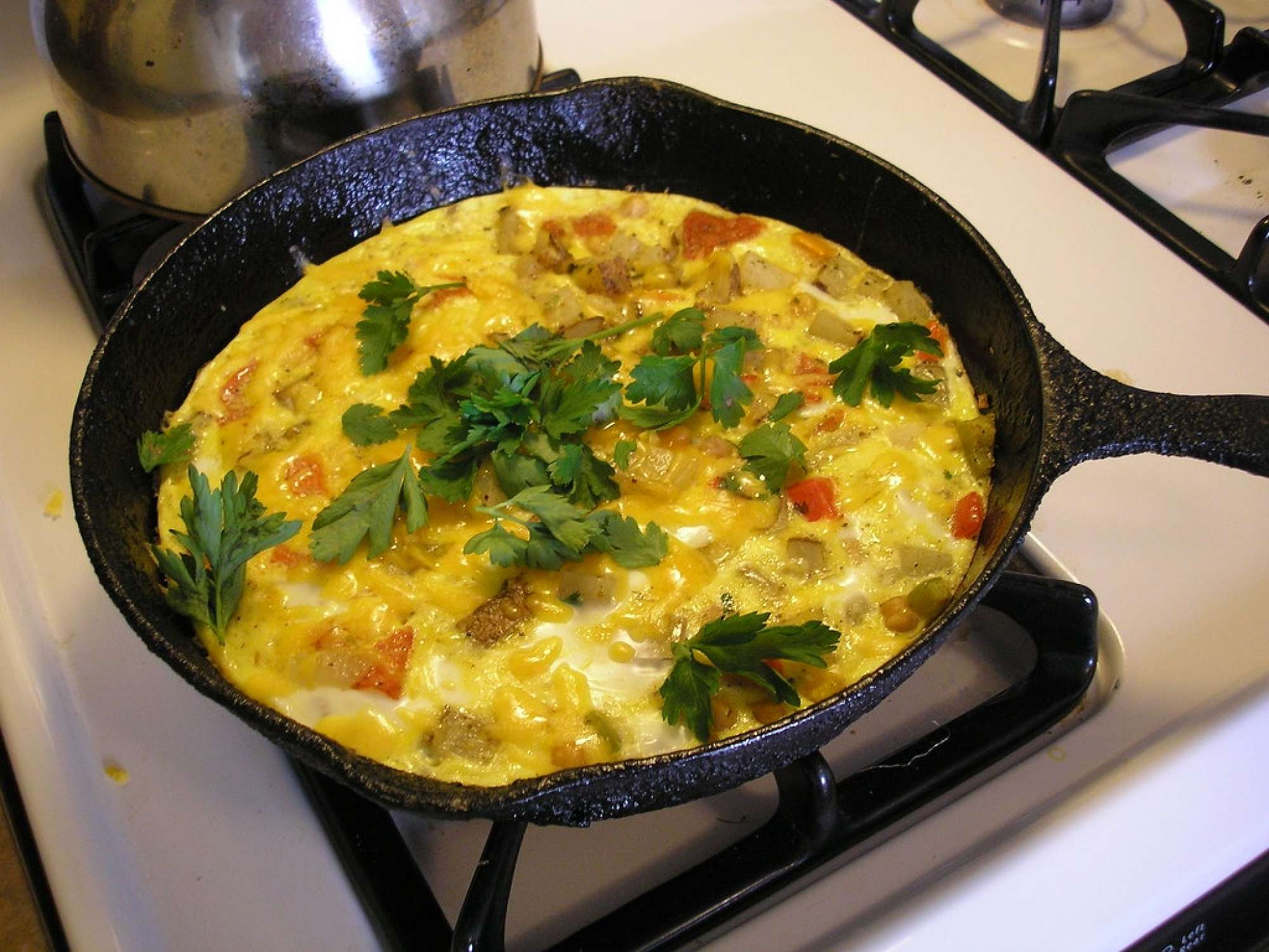Pour the egg mixture into the hot pan, quickly add potato and fresh herbs. Top with grated cheese.