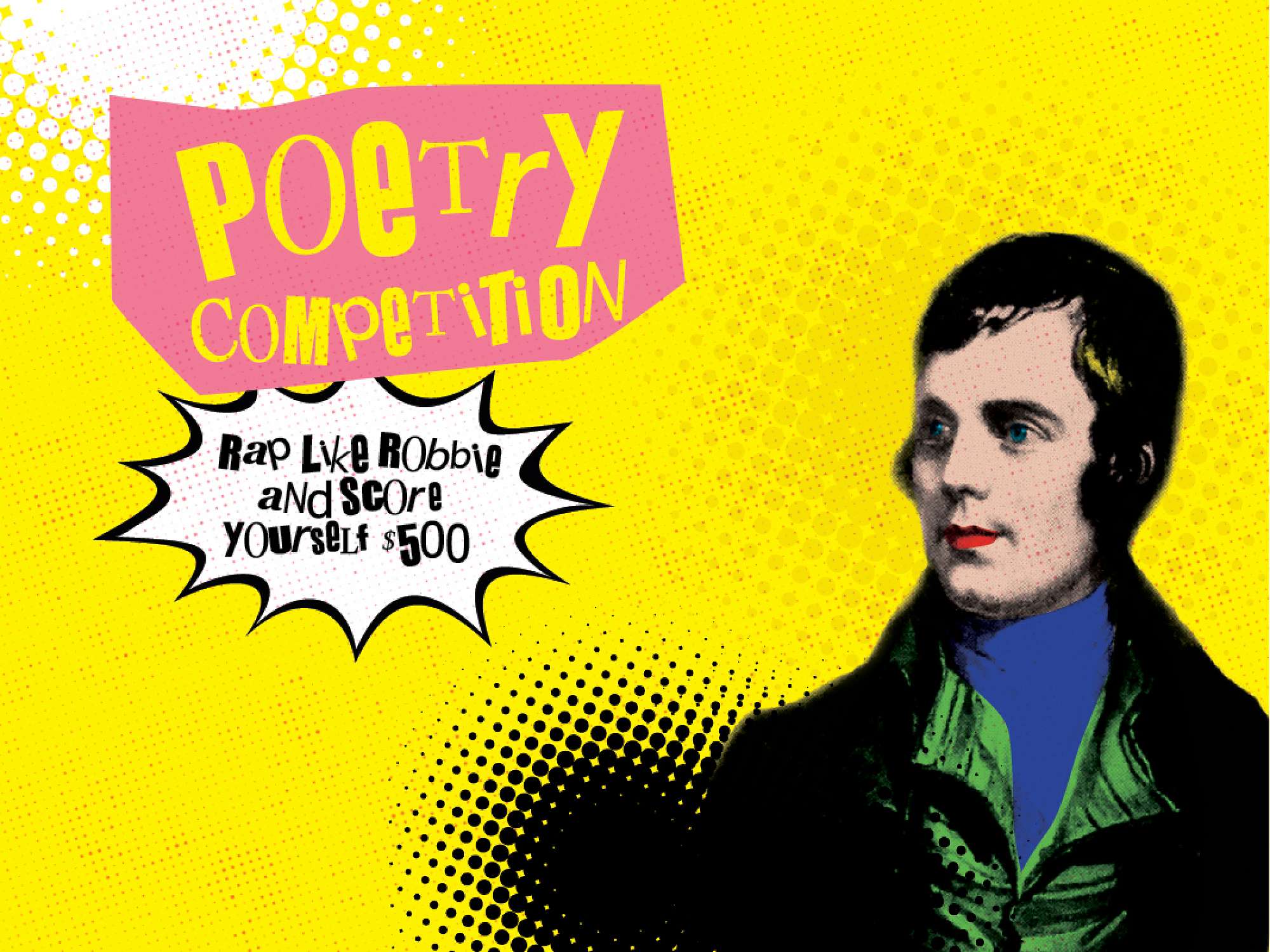 Write a poem in English or Scots, inspired by the life or works of Robert Burns in no more than 500 words, and submit it by 1st December. Cash prizes and tickets to the annual Robert Burns Supper for first place winners in each category.