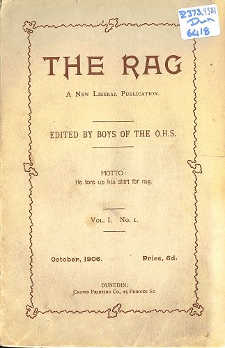 The McNab Collection at Dunedin City Library includes a rare copy of the sole issue of The Rag – a periodical controversially published by pupils at Otago Boys’ High School in October 1906.
