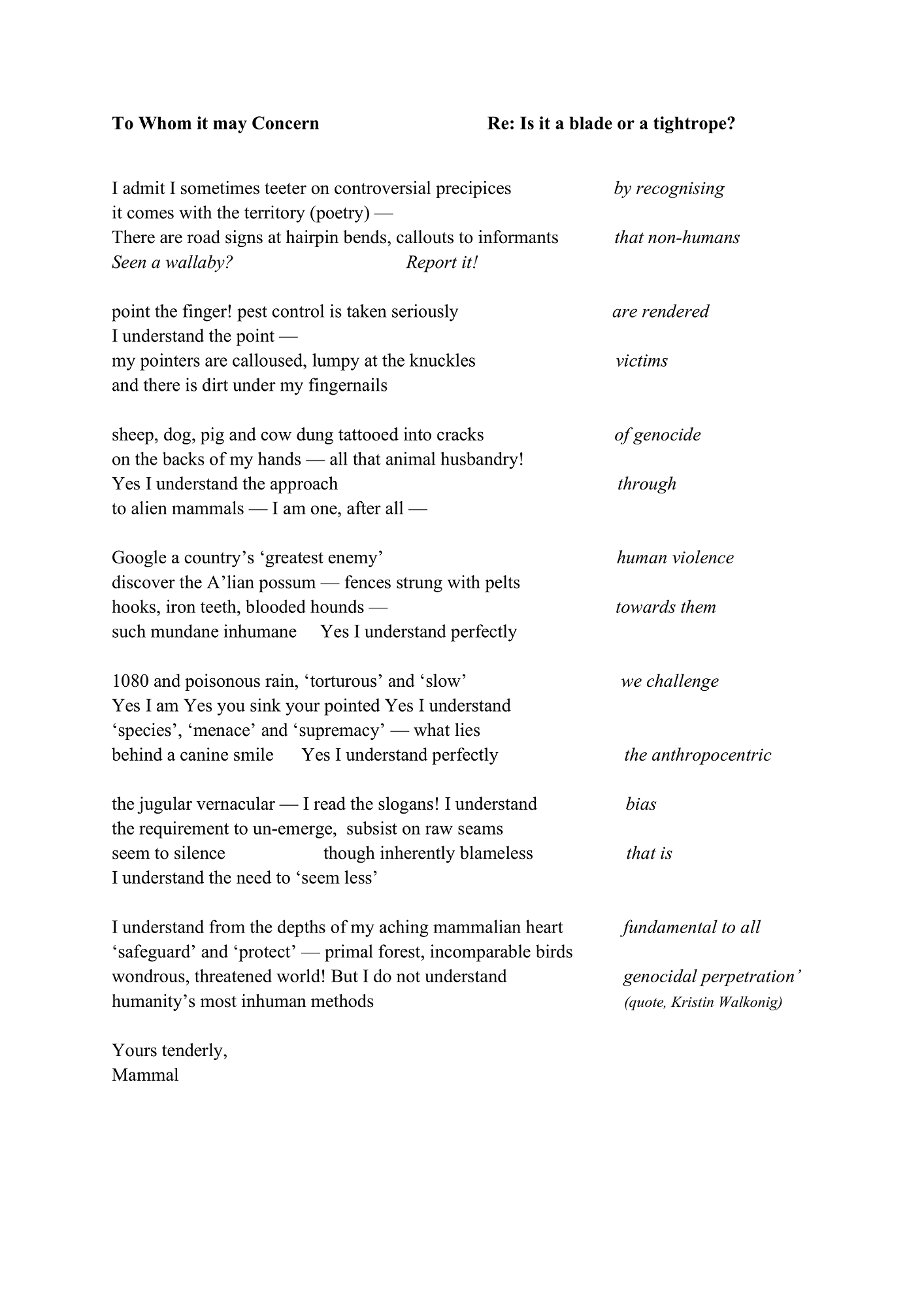To Whom it may Concern / Re: Is it a blade or a tightrope? Sophia Wilson — August 24th, 2023 By Sophia Wilson Image by: Sophia Wilson