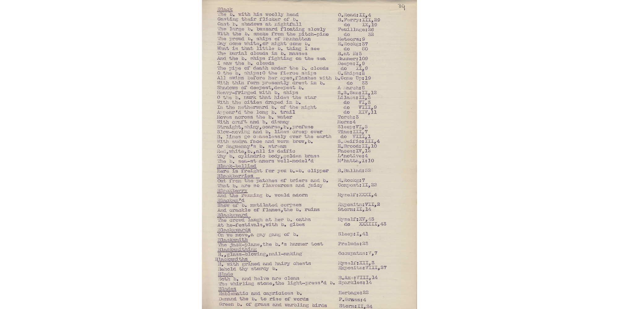 The Walt Whitman Collection comprises more than 680 volumes, including numerous editions of Whitman's classic work Leaves of Grass, from the 1856 second edition to modern publications. One of the most interesting items in the collection is the Concordance of Walt Whitman's Leaves of Grass, a typescript in two volumes, compiled by Trimble and his wife, and containing a total of 61,201 entries.