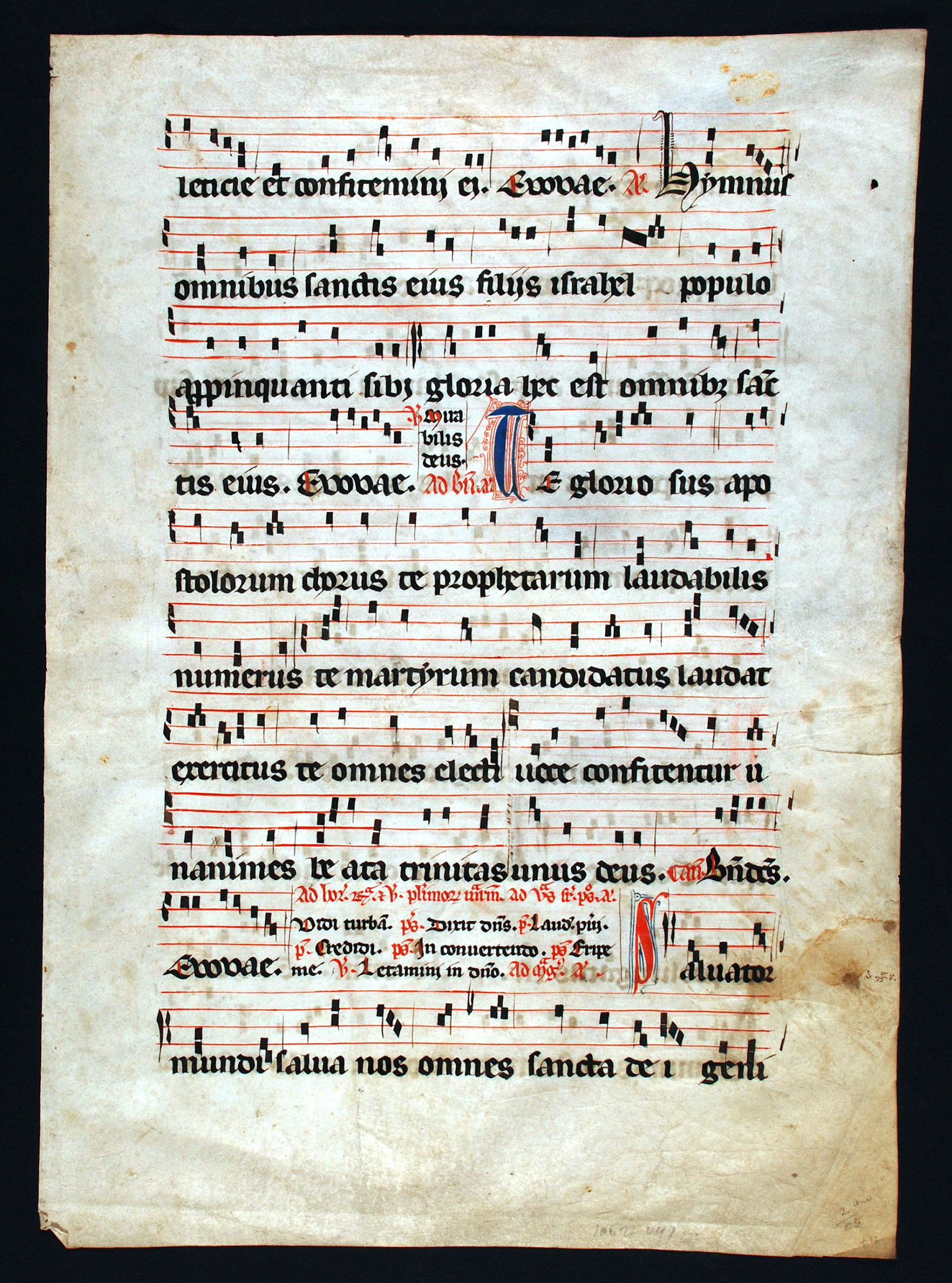 The collection has four examples from the 14th century including the following, a Latin antiphonal from Germany. It is a single leaf, part of Vespers for the feast of All Saints. This one is more decorative than the 13th century example, with calligraphic initial letters in red or blue with contrasting penwork, and musical notation is again on a 4-line stave.