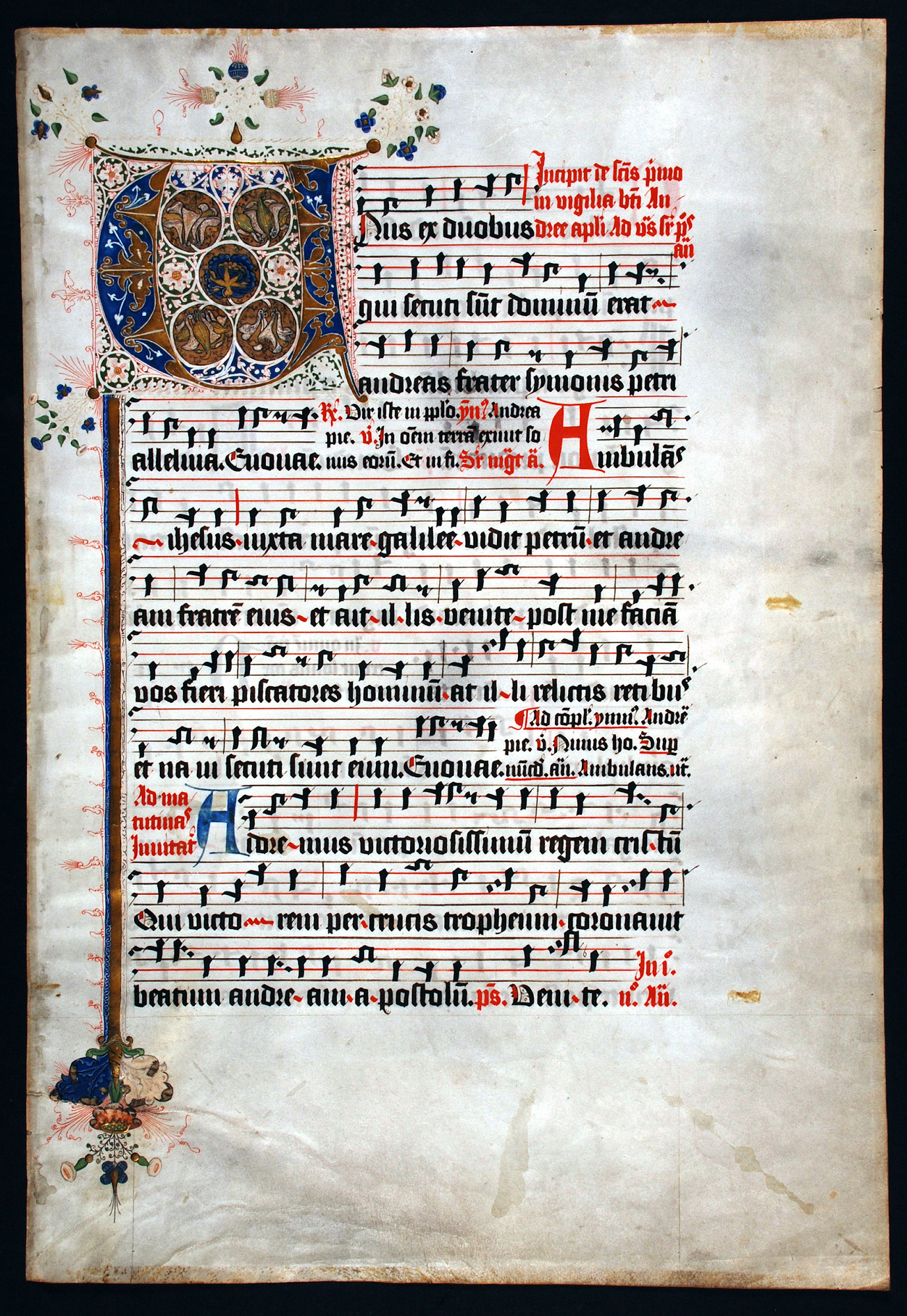 The 15th century example below is more decorative again. It is another Latin antiphonal from Germany, part of the Vespers and Matins for the feast of St Andrew. Notice the large initial ‘U’ with full colour floral border and the small initials in red and blue. The musical notation is in Hufnagelschrift neumes on a 5-line stave.