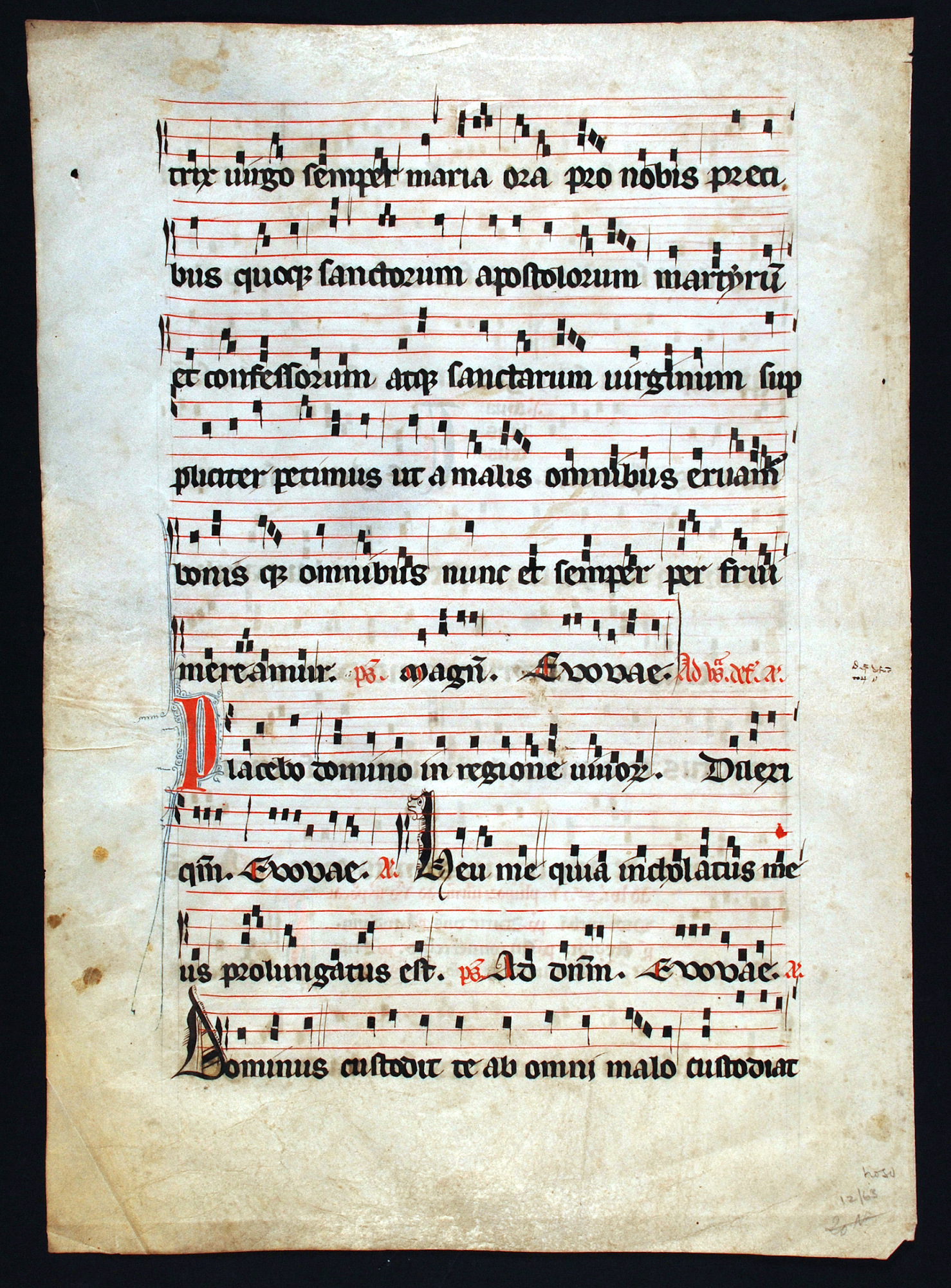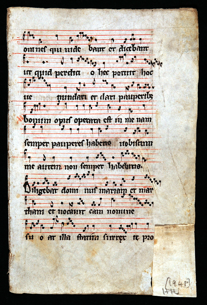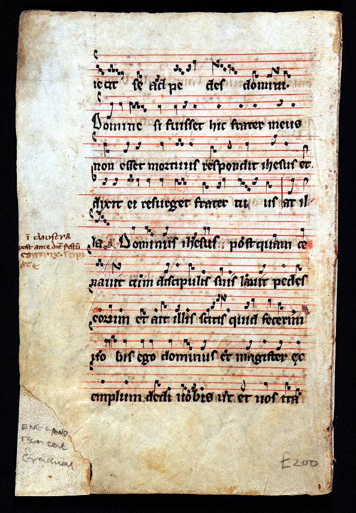 Most surviving medieval and renaissance music scores are of a religious nature and written for voice, not instrumental. Those in the Reed Medieval and Renaissance Manuscripts Collection are no exception. Our earliest score is this Latin Antiphonal from 13th century England, comprising two leaves. Fittingly for this time of year, the second leaf, shown here back and front view, is an antiphonal for Maundy Thursday. You’ll notice the musical notation is different to modern scores. The notations are called neumes and in this and most of our examples, they are on a 4-line stave.