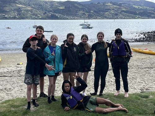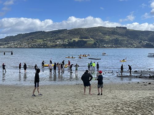 The second part of the challenge was a kayaking relay at MacAndrew Bay. Students were paddling a double kayak around a short course before running up the beach and tagging the next two team members. Again it involved working together to get the job done, in particular, supporting each other at the beginning and end of the paddle and holding the kayak for the next pair. This was cold!!!! But the students stuck at it. The paddle got shorter and the run longer as the tide crept out, but everyone kept going hard for the entire hour.