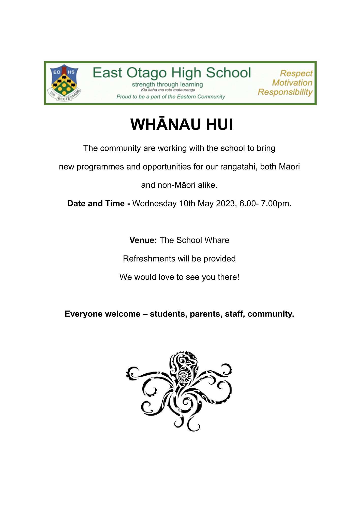 All welcome to attend the Whanau Hui to be held on Wednesday 10th May 2023 from 6pm.