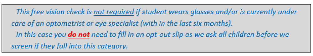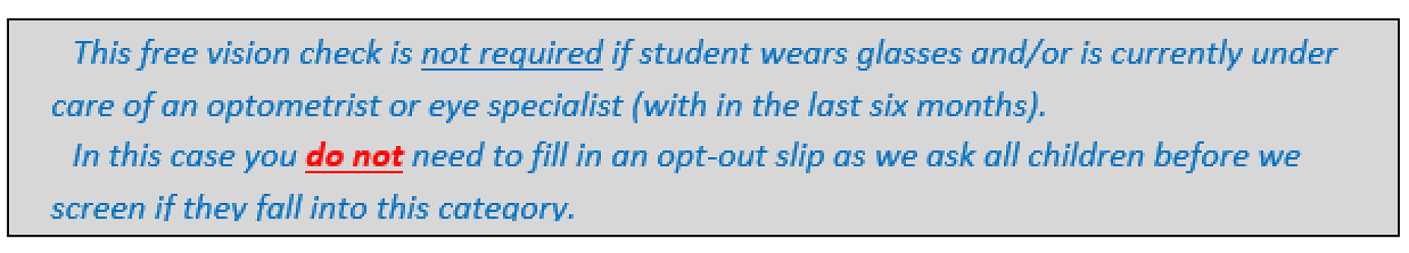 If you do not wish your child to be screened, please fill out an opt-out slip, which are available at the school office before our visit.