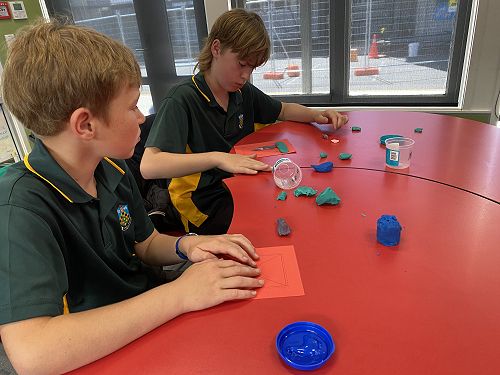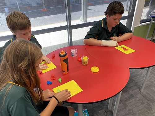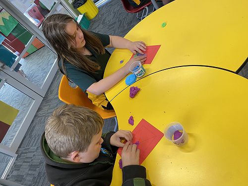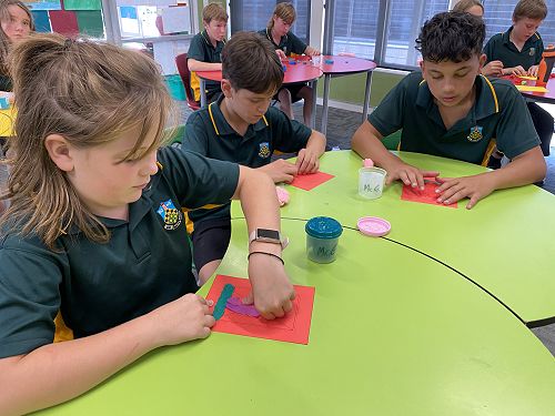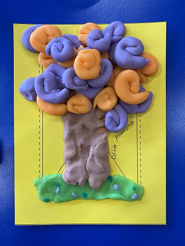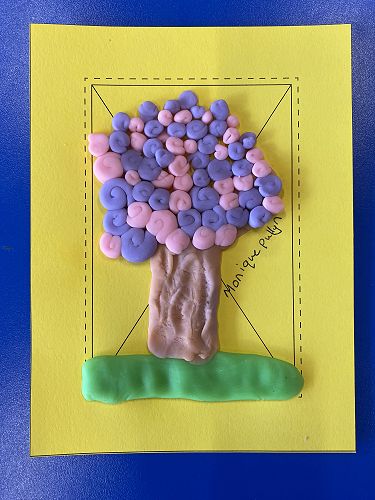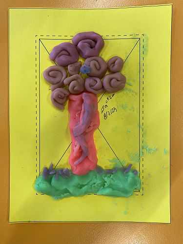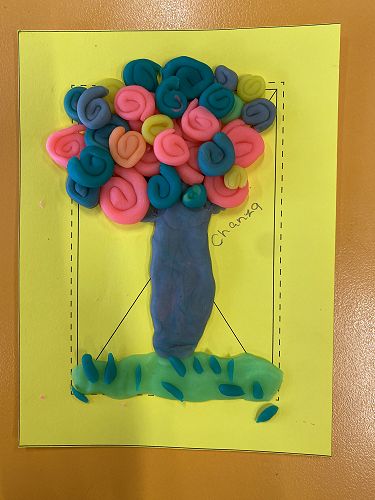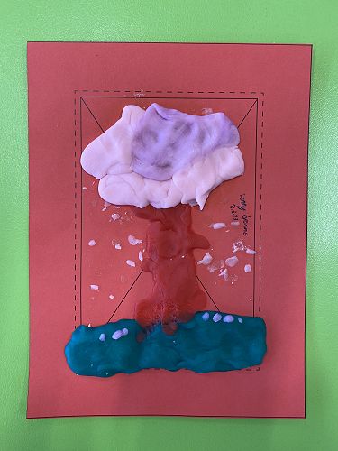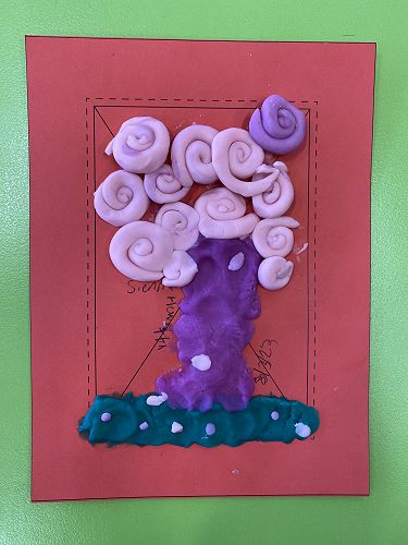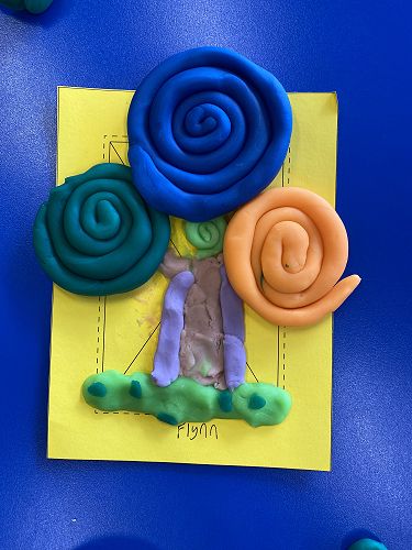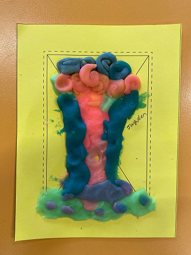 They used various colours of play-doh and used these to create a 3D image of a tree on a photo card. They were first asked to put in a grass base, add a trunk in the centre of the sheet, and then add other colours rolled up to look like the main part of the tree.