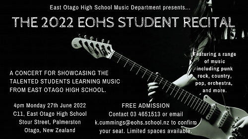 It’s that time of year again. The EOHS Music Department presents the 2022 Student Recital at 4pm on Monday 27th June in C11 at East Otago High School.
