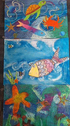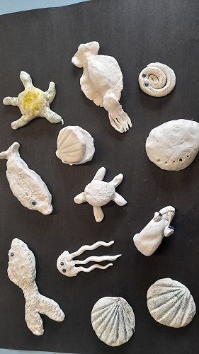 The Year 7 and 8 students have been looking at Still Life in art and have been sketching from still life objects including clay cupcakes they made. The theme over the past few weeks has included a sea theme and the students have been using a range of media, including pencil, dye and crayon as well as soft pastel to record images of paua shells and fish. They have then used air dried clay to create sea creatures looking at proportion and attention to detail.