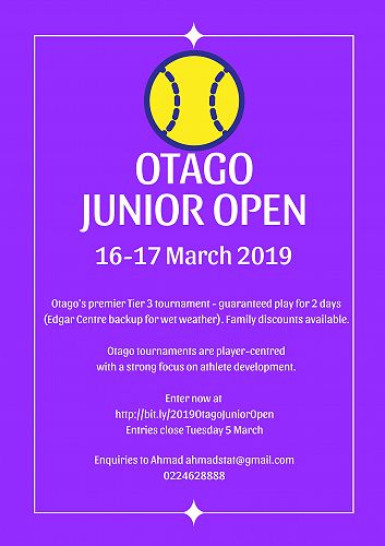 Photo by Garth Powell TENNIS OTAGO Garth Powell — February 25th, 2019 Gallery Attachments 2019 Otago Junior Open Poster