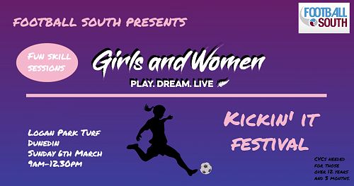Their first event is Kickin' It! This Sunday at Logan Park turf between 9 am and 12:30 pm (Poster below). This event is a football festival filled with fun games and skills. It's great for anyone wanting to try football for the first time or people wishing to challenge their mates. Registrations are still open here Football South-Football South (sporty.co.nz).