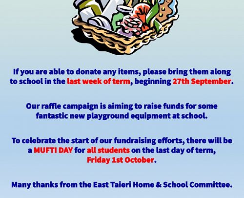 Please see the attached notice for important information about upcoming Home & School fundraising raffles AND a mufti day for this term.