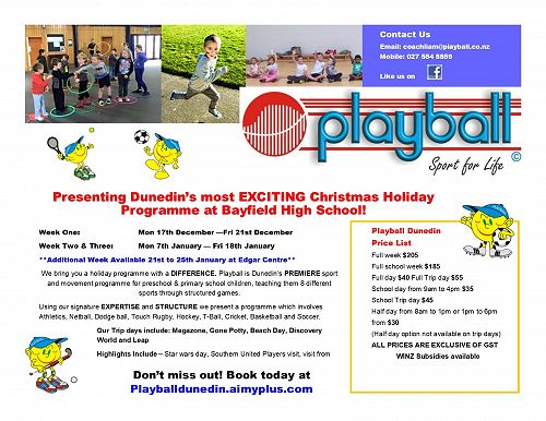 Don't forget to enrol in the Summer Playball Holiday Programme. We will be operating from Bayfield High School during the upcoming holidays 8 am - 6 pm Daily. With specialised sports clinics delivered to children via our highly trained coaches, everyone is guaranteed to have lots of fun. In addition to this, we have Trip Days to Gone Potty, Laser Force, Leap & Discovery World. For the full schedule and more information head to http://playballdunedin.com/ or email: coachliam@playball.co.nz. Be QUICK as spaces are filling fast. WINZ Subsidies available.