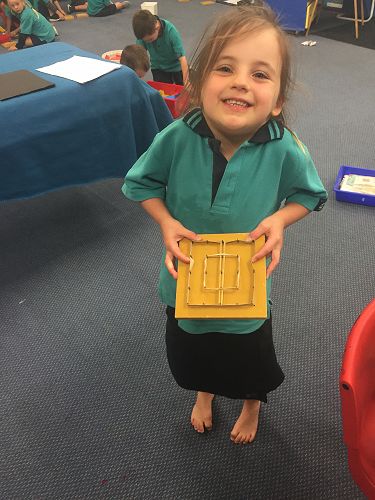 After this we rotated around different activities in all the Junior classes. We found out about 3D shapes like cylinders, spheres, cubes and cones. We even got to go outside hunting for them in the playground. There are shapes all around us - they make up most things we use and go together to make objects. We made rockets, tractors, houses and patterns. We had a lot of fun while we were learning!