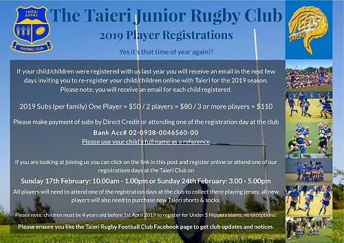 2019 Taieri Junior Rugby Player Registrations