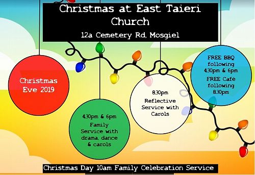 Photo by Garth Powell EAST TAIERI CHURCH SERVICES Garth Powell — December 2nd, 2019 Christmas Eve services at East Taieri Church. Gallery Attachments ET Christmas Eve Poster