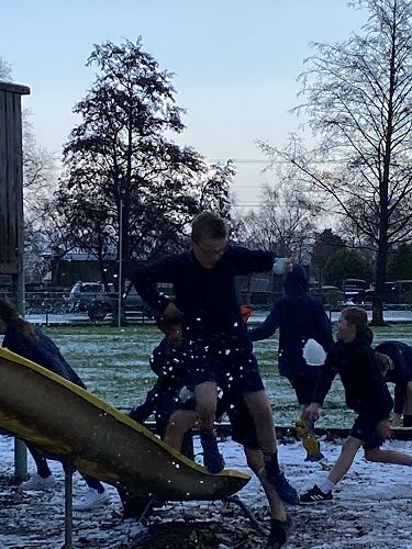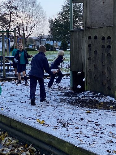 As my class runs out to the field my heart beats 1000 miles per hour, getting ready for the fight. As Miss Agnew said go to your corners boys and girls I get so excited. All the boys grab cones and fill them with snow. I fill my cone up and look for a target. “ Okay,” I said to myself “I’ve found my target - Charlotte.” I hit her all down her back. I got quite hungry and decided to eat some snow, it tastes like ice I guess. We held the snow fight on the field and the playground. It was a great place to have it. My fingers were so numb even though I still had gloves on. I felt cold. There were bark chips in the snowballs as we scooped the snow up. I heard people screaming (the girls). The boys had cones and some of us had bare hands. This was the best day ever!