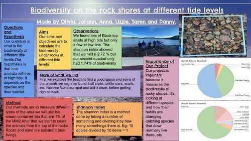 On the third visit, we started to prepare our group presentations. The objective of our project is to calculate the biodiversity under rocks at different tide levels. Our group has chosen to create a poster and a stop motion video to show and explain to people how to use a quadrat. We started by practising drawing sea creatures, my role was to draw seaweed, chiton, sea stars and limpets. A short time later we started to write the script. When half of my group started to make the stop motion video the other half of the group was working on the poster. The stop motion video was way harder than we had thought it would be but we managed it well!