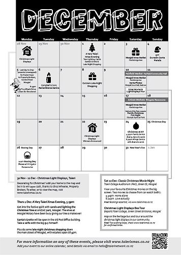Taieri Network has been busy planning for 'A Very Taieri Christmas': a month of events celebrating the festive season throughout the Taieri Plains. See attachments also.