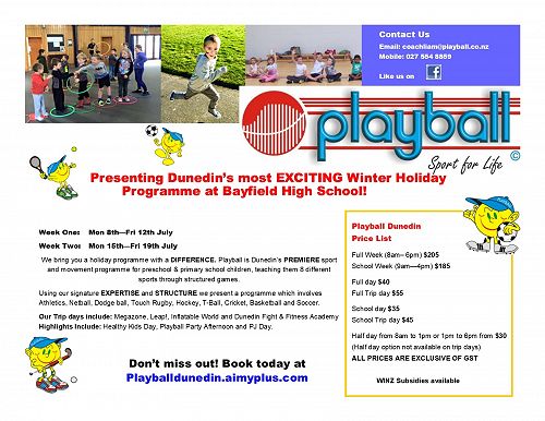 Don't forget to enrol in the Winter Playball Holiday Programme. We will be operating from Bayfield High School during the upcoming holidays 8 am - 6 pm Daily. With specialised sports clinics delivered to children via our highly trained coaches, everyone is guaranteed to have lots of fun. In addition to this, we have Trip Days to Leap, Dunedin Fight & Fitness Academy, Inflatable World & Mega Zone. For the full schedule and more information head to http://playballdunedin.com/ or email: coachliam@playball.co.nz. Be QUICK as spaces are filling fast. WINZ Subsidies available.
