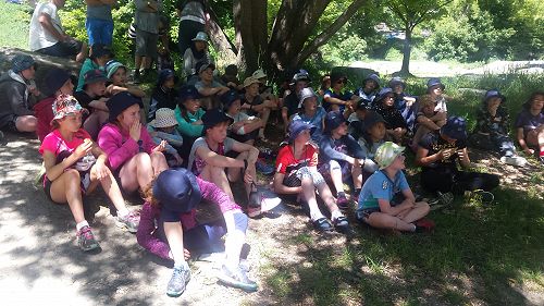 We line up in single file and begin our journey on the stony, steep and tiring track. Halfway through the walk most of us are panting in the scorching sun. My drink bottle, wetsuit and jacket weighs me down as I trudge up the steep hill. Finally we arrive at our destination the calm water is disturbed by a rough wave coming from a boat. Our instructor turns around and tells us to get into groups of 6. Everybody turns to their neighbour and sorts out their groups. We jump into the boat and nervously wait for the engine to start . We arrive at John Bull Gully Picnic Area excitedly, - the engine stops once again and we jump onto the stoney sand. We look around and make our way over to a giant rock already filled with another group of six. I tell them to make way and plop myself down. Georgia and Keisha make their way up the rock as well and sit down beside me. We chant “Splash us, splash us, splash us!“