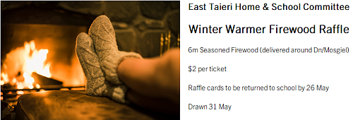 Support the Home and School committee by selling tickets to win 6m of seasoned wood in our Winter Warmer Raffle. Funds raised will go to the school for various resources as needed by staff - for example, we have just purchased a set of Boom Whackers for the music department & helped with new singlets for the Sports Department!