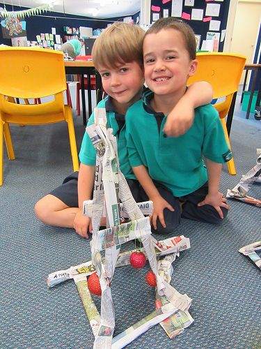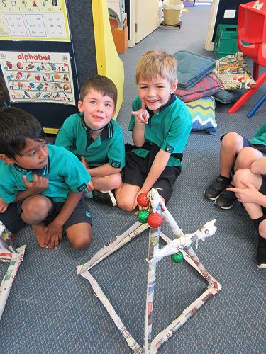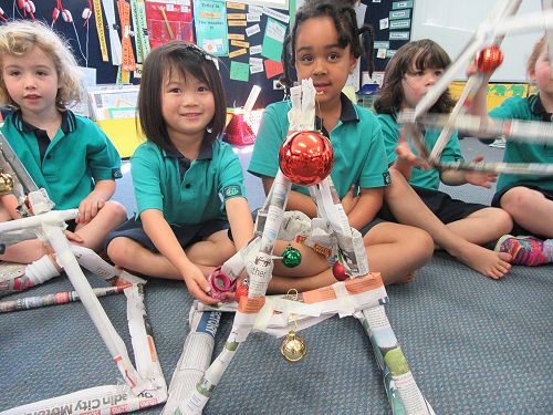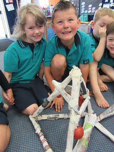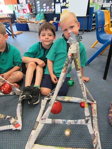 The children in Rooms 9 and 10 worked in pairs to create newspaper Christmas trees. This was part of our STEM inquiry where we have been developing our engineering skills. The trees had to be strong enough to stand alone and to hold Christmas baubles. Here are photos of a few of the trees. Come in and have a look at all of them.