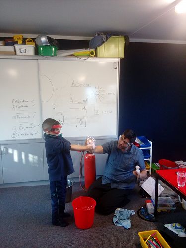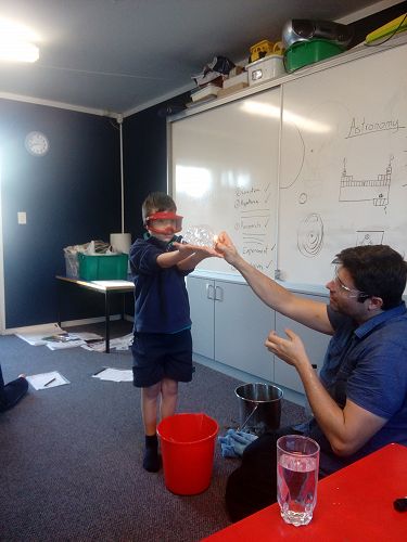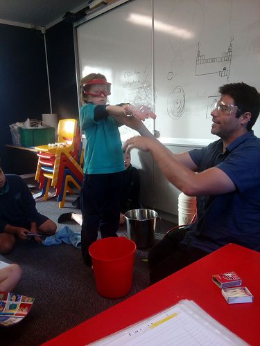 At morning tea time Amadeo then did an extra special experiment with the whole school. He combined liquid nitrogen and boiling water to create a weather cloud.