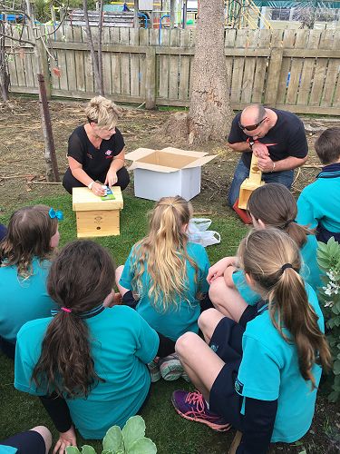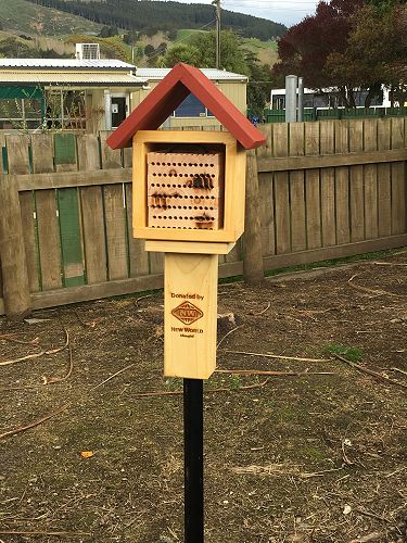 On Friday we were lucky enough to receive a Leafcutter Beehouse, kindly donated by Mosgiel New World. Jo from Mosgiel New World and Hayden installed the bee house in our school vegetable garden and provided us with information about these special bees.