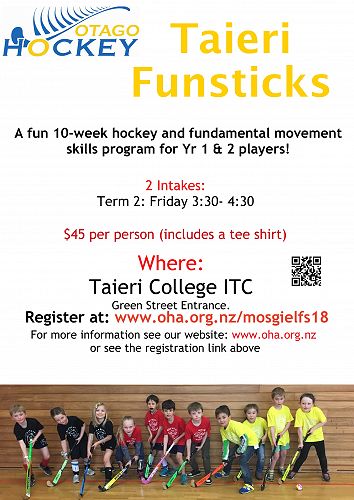 Taieri Funsticks Hockey. This is a great 10 week programme for Year 1 and 2 children right here on the Taieri. Term 2 on a Friday afternoon from 3.30 - 4.30pm at Taieri College