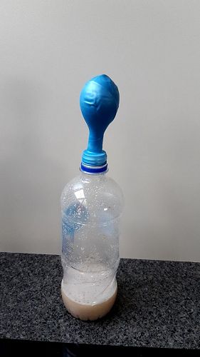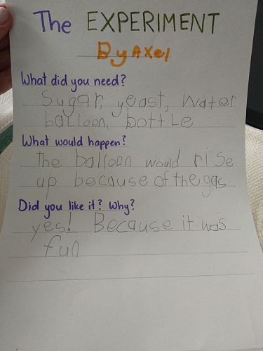 We read the book ‘The Little Red Hen’ and asked the question ‘How does yeast make things rise’? We did a ‘live’ experiment with some yeast, sugar, warm water, and a balloon and we discovered that when the yeast muches away on the sugar it produces carbon dioxide and this made our balloon blow up! This same carbon dioxide gets trapped by the stretchy gluten in the bread and makes it rise. Axel didn’t have any yeast so he did an amazing whirlpool experiment!